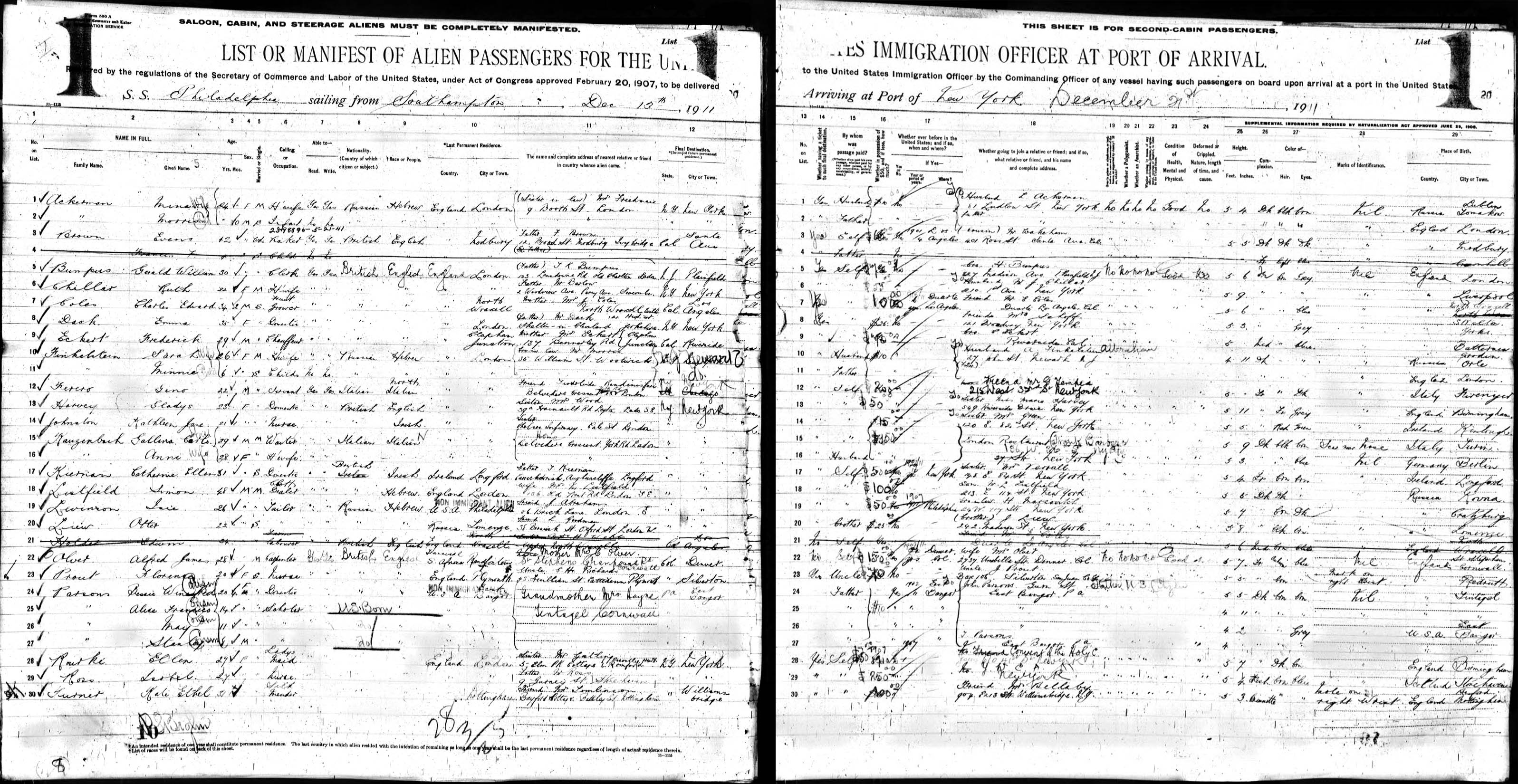 1. “Pasenger Manifest SS Philadelphia,” Year: 1911; Microfilm serial: T715; Microfilm roll: T715_1787; Line: 14; ., Microfilm.